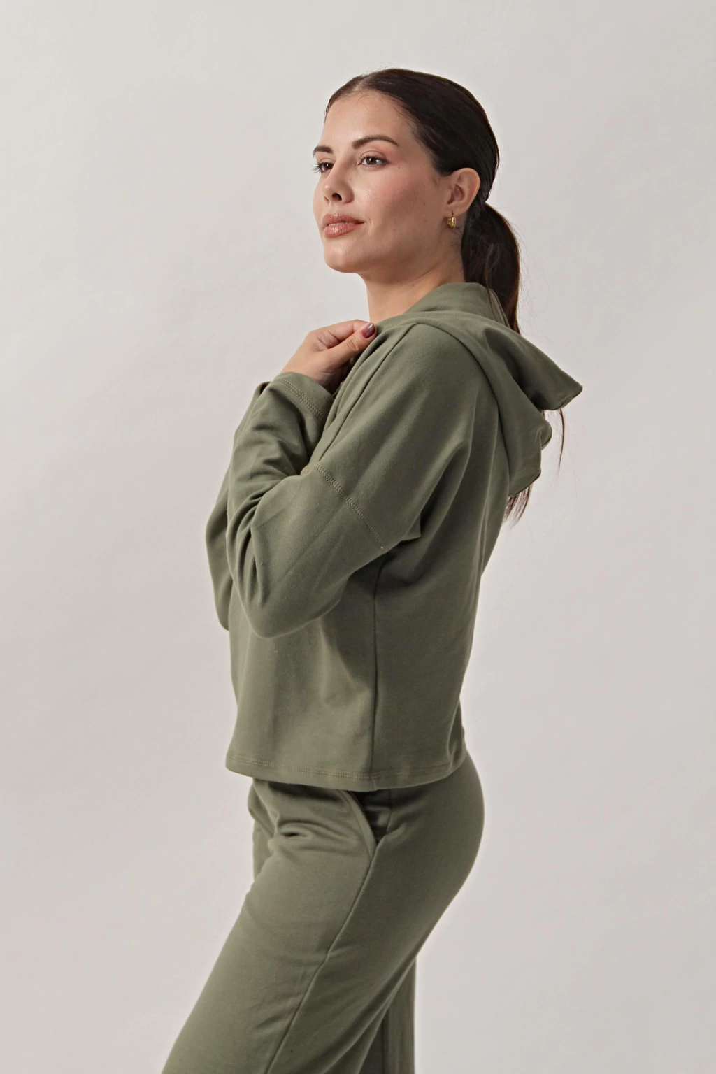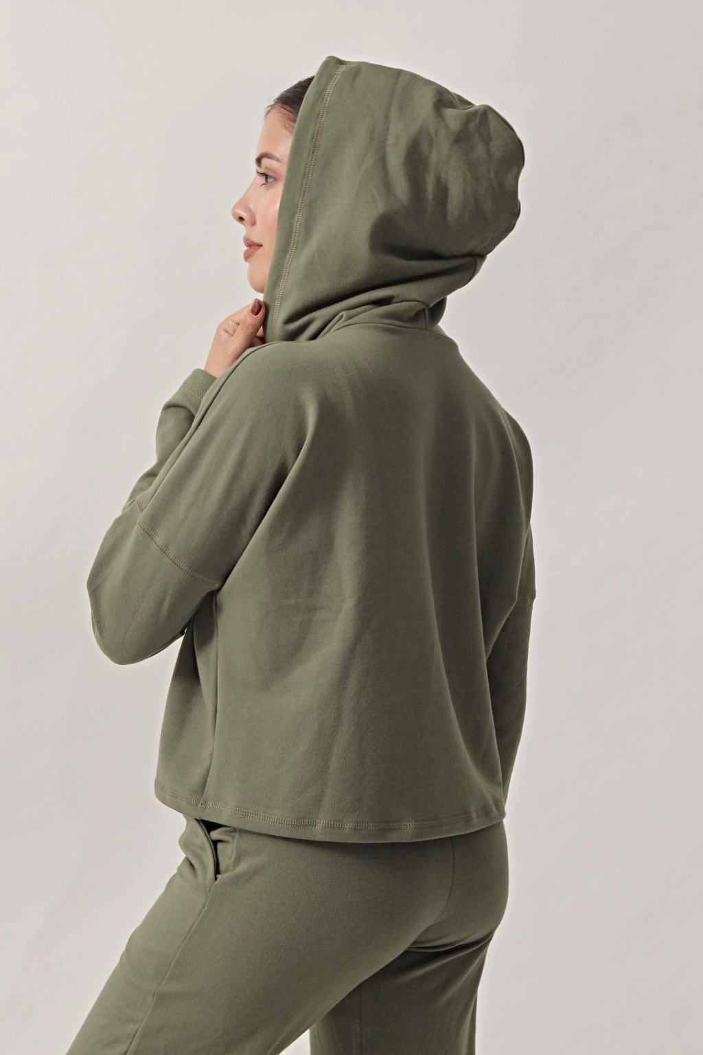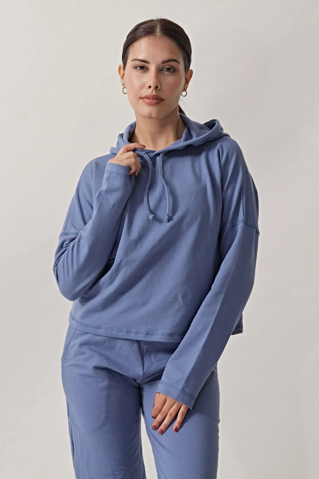 Buzo suelto con capucha y cordon, fabricado en Algodón.