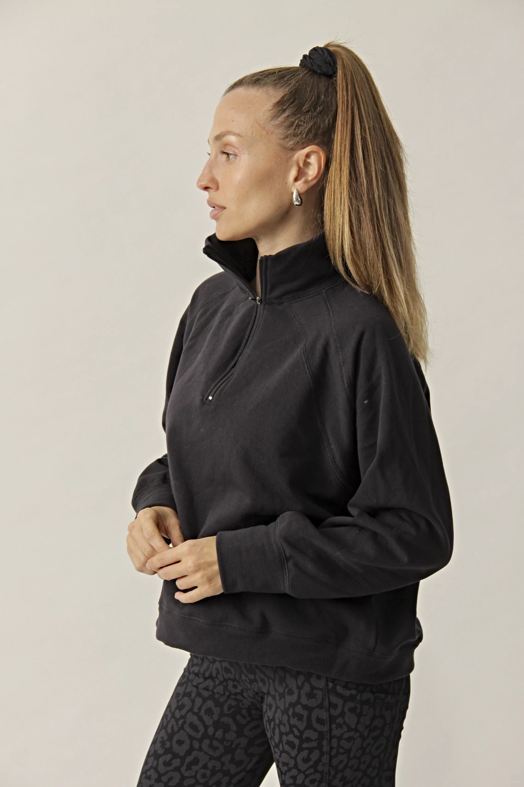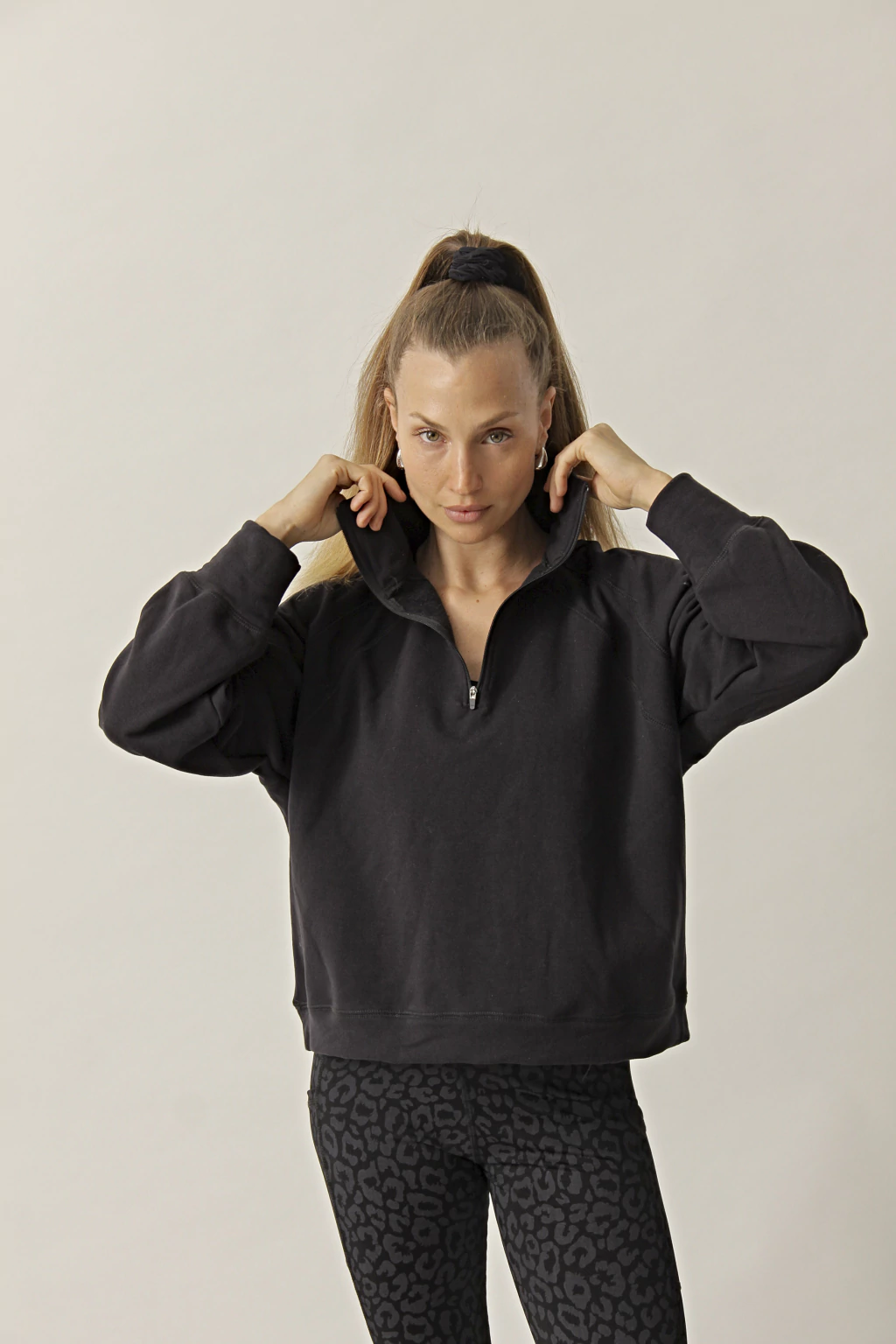 Buzo suelto,con recorte en manga y cuello alto con cierre