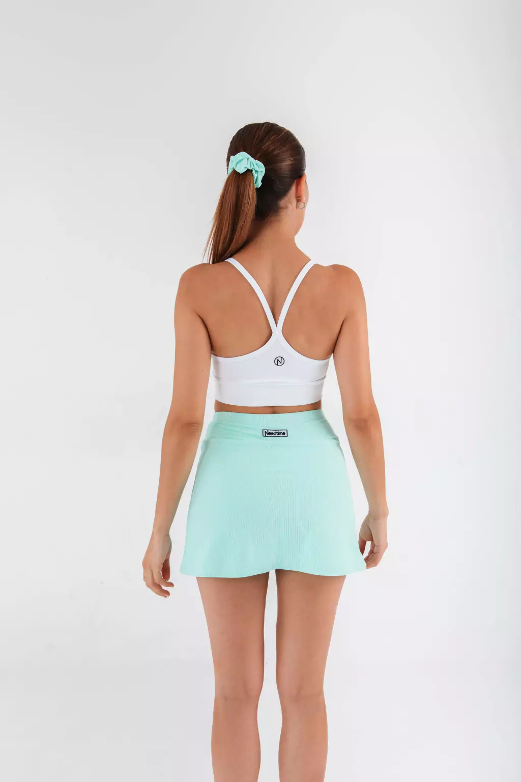 Pollera short con bolsillo, tiro alto, en tela de cuadradito